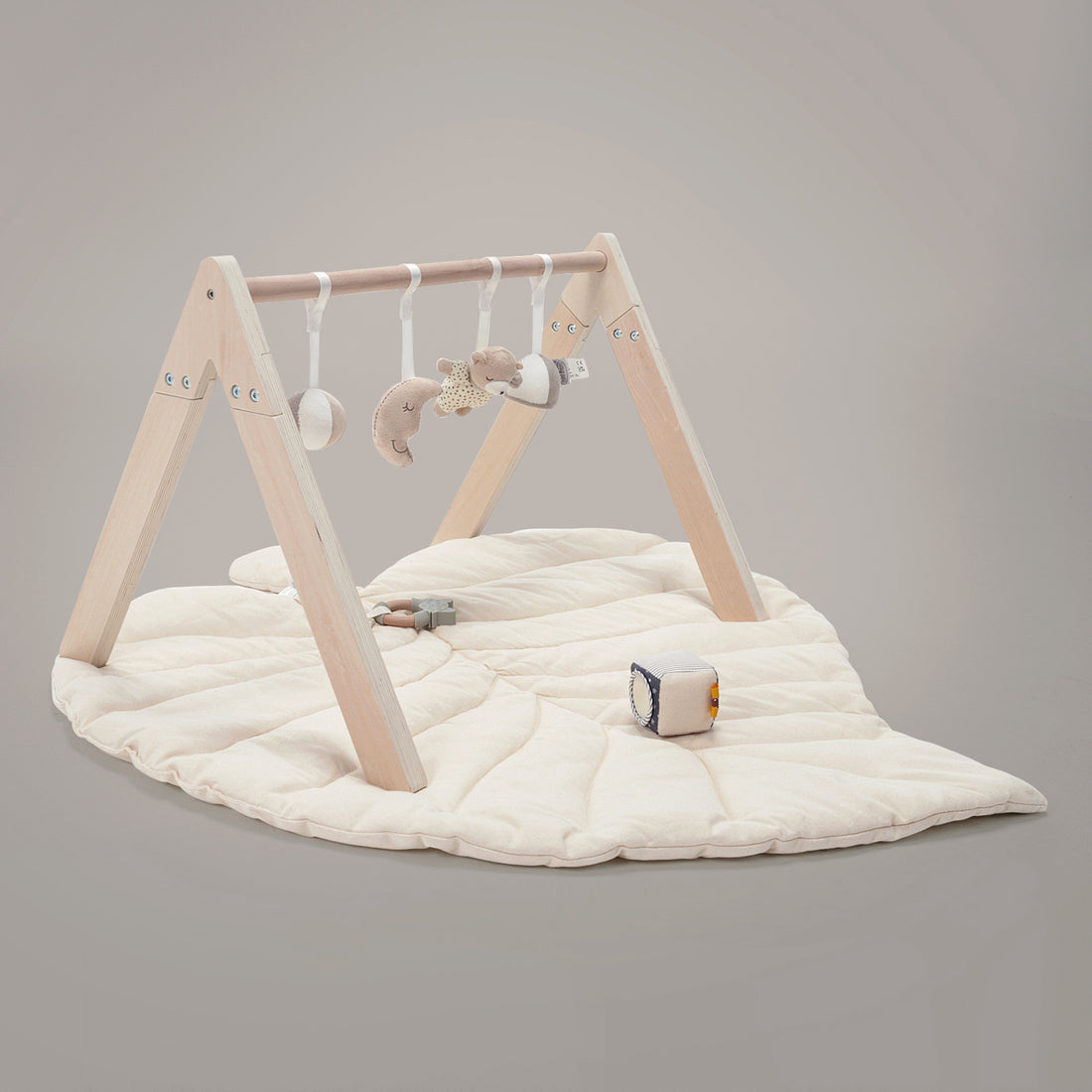 Our wooden baby gym is ideal for supporting your baby's development and learning. Our thoughtfully designed baby gym promotes motor skill development, cognitive growth, and sensory exploration. Our versatile leaf playmats also complement our play gym, providing a safe and engaging environment for tummy time and learning.