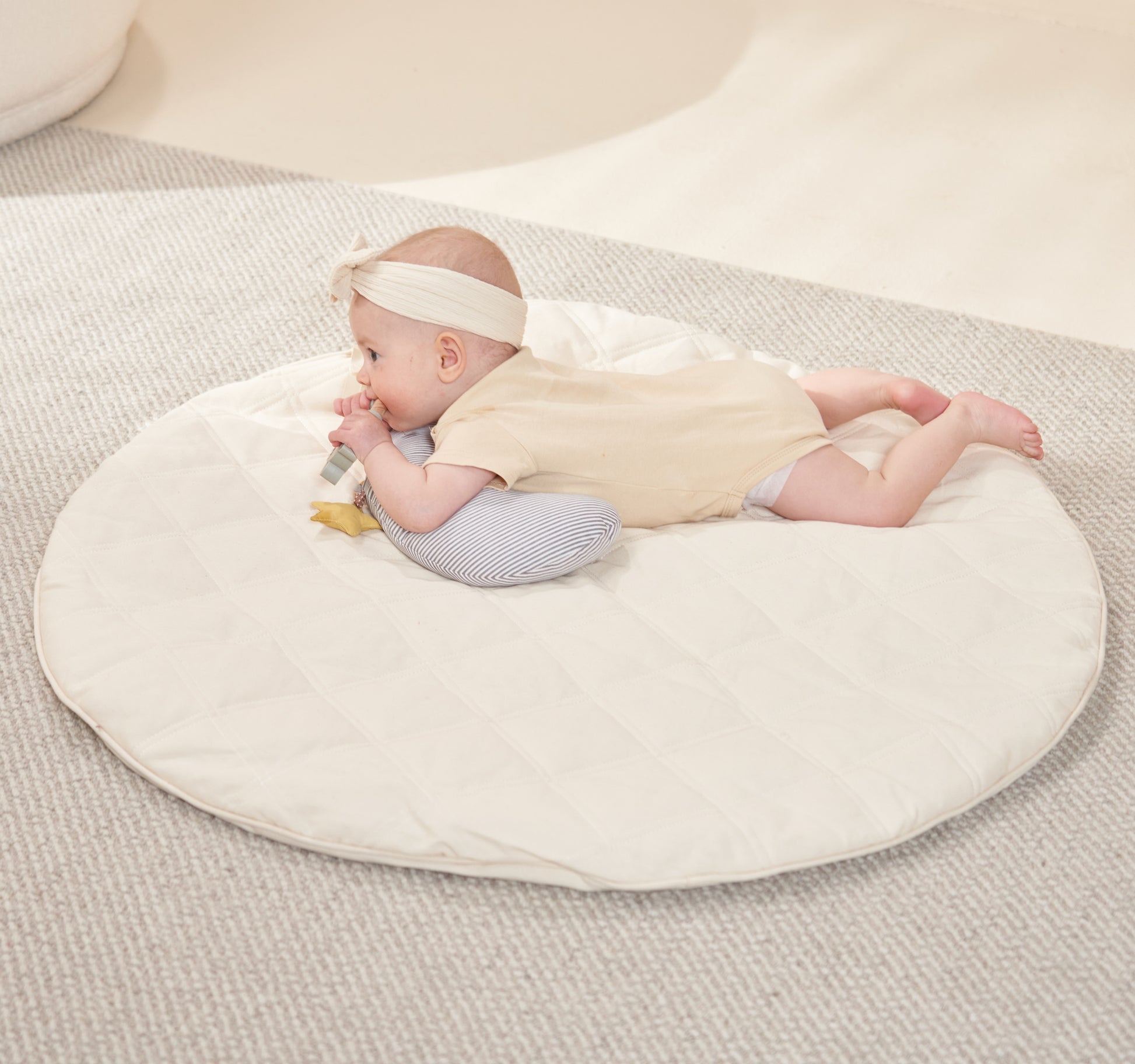 Our baby play mat and activity gym are perfect for babies from 0 months+. It includes 5 hanging toys, 1 mirror, 1 tummy time pillow and 1 attached teether, which helps your baby's rolling, crawling, exercising and learning. With this 90° cm playmat, babies also can play independently. This playmat keeps toys in one place, creating a clean and contained play zone for the babies.