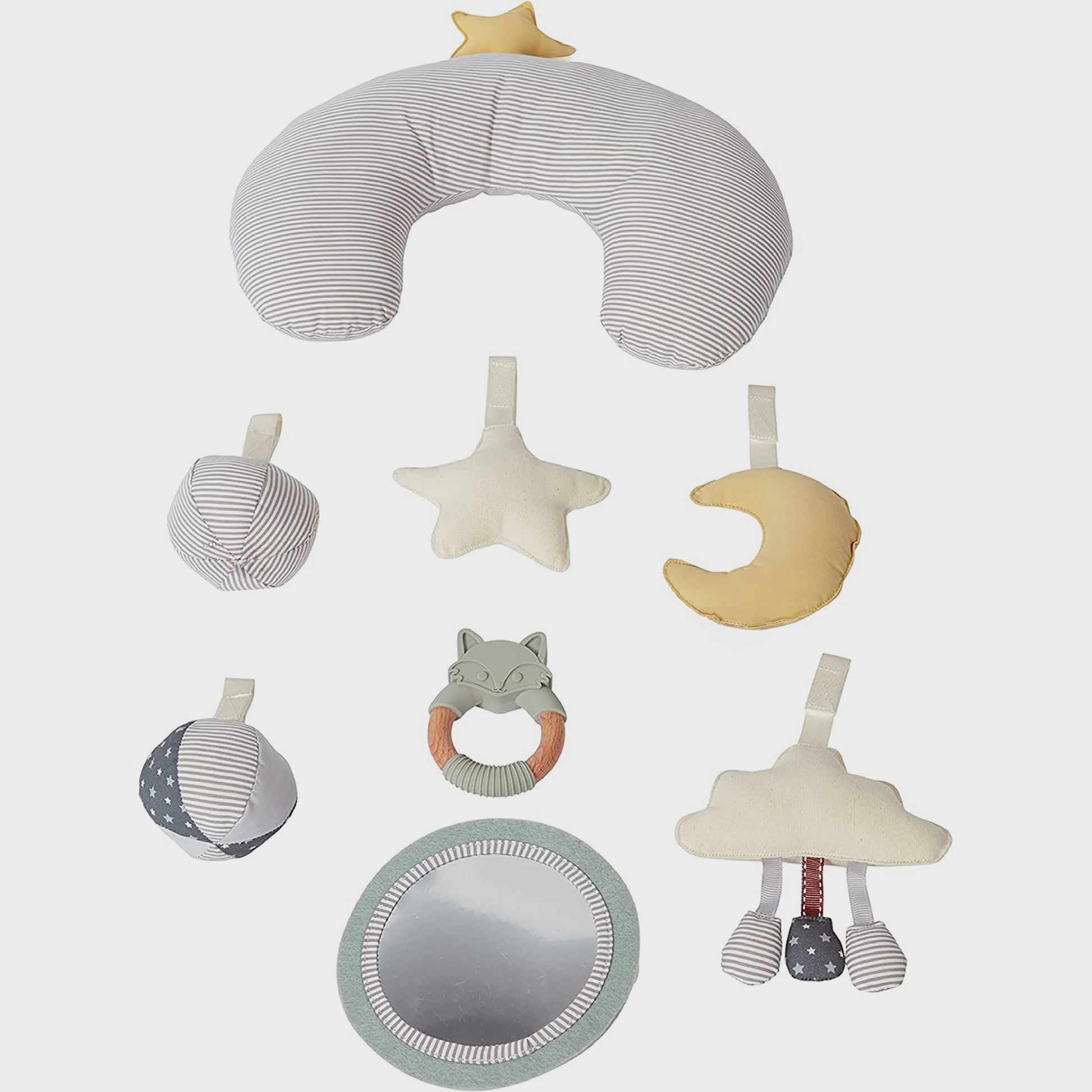 - Includes 5 hanging toys, 1x mirror, 1x tummy time pillow and 1x teether